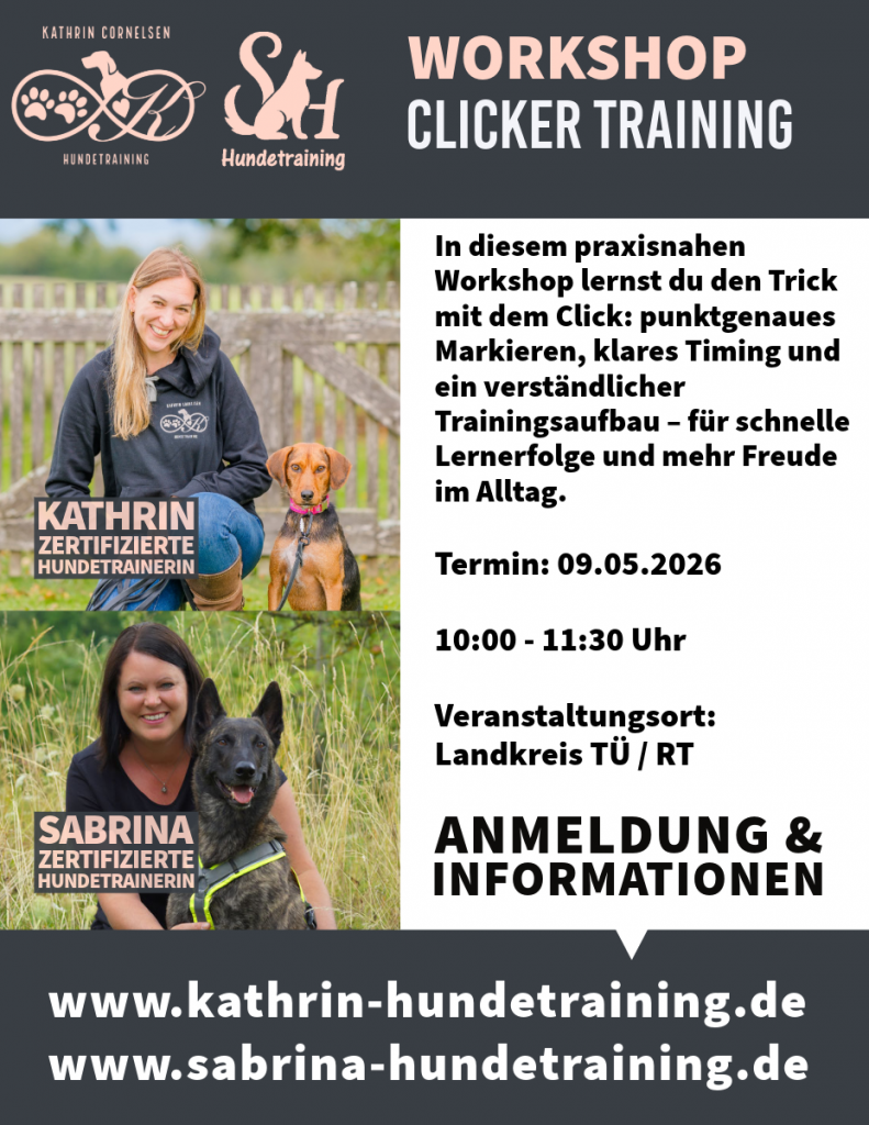 In diesem praxisnahen Workshop lernst du den Trick mit dem Click: punktgenaues Markieren, klares Timing und ein verständlicher Trainingsaufbau – für schnelle Lernerfolge und mehr Freude im Alltag.